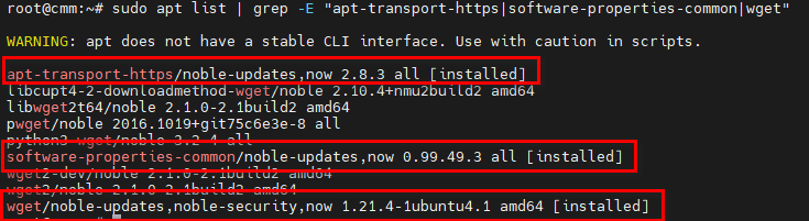 sudo apt list | grep -E "apt-transport-https|software-properties-common|wget"