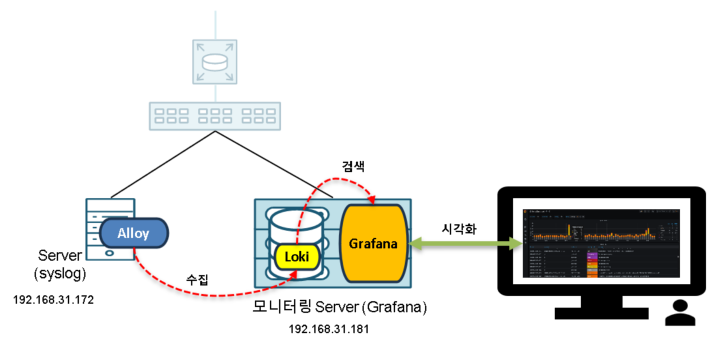 - Loki (저장/검색) : 데이터 저장 및 검색 (수집된 로그 보관, 레이블로 관리)